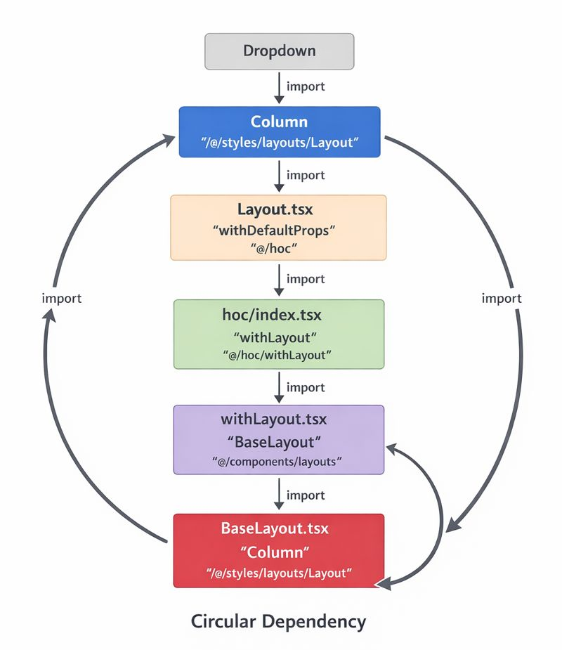 ➡️ 결국 Column이 BaseLayout을 참조하고, BaseLayout이 다시 Column을 참조하는 순환 참조 발생!현재 hoc/index.tsx에서 withDefaultProps, withAuth, withLayout을 한꺼번에 export하고 있기 때문에,